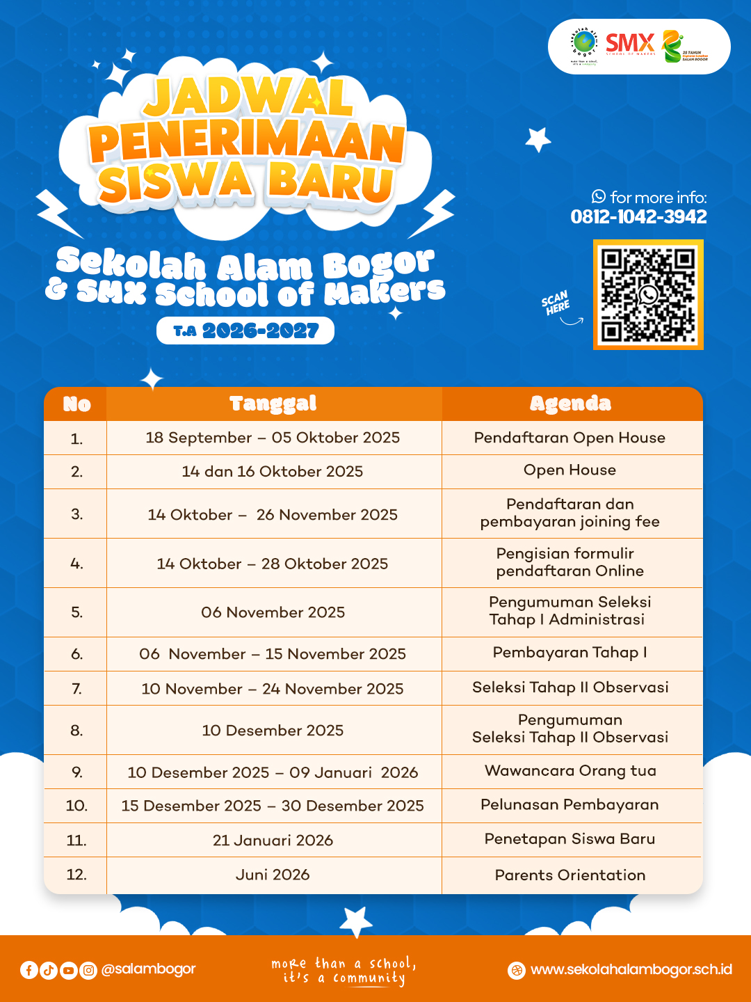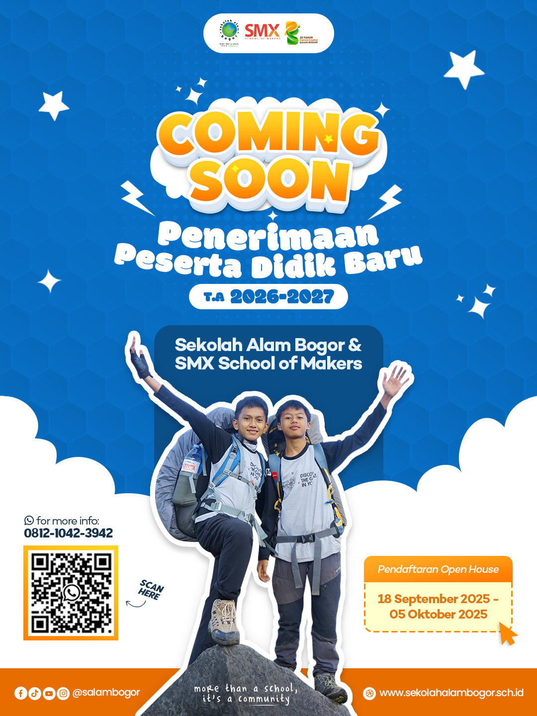 Selamat datang di Website Penerimaan Peserta Didik Baru (PPDB) Sekolah Alam Bogor T.A 2026/2027, Open House merupakah Kegiatan pengenalan Value serta model pembelajaran di Sekolah Alam Bogor, sebelum orang tua mendaftarkan calon siswa. berikut izin kami informasikan salah satu syarat usia pendaftar Open House adalah sebagai berikut :