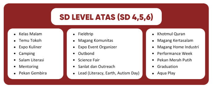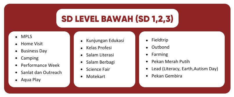 Program Sekolah Dasar diperuntukan untuk anak usia 6 – 12 tahun. Dengan menitik beratkan Pendidikan untuk mencari dan memahami potensi diri . Diluar pembelajaran dikelas, siswa pun memiliki beragam kegiatan yang untuk mengembangkan potensinya.
